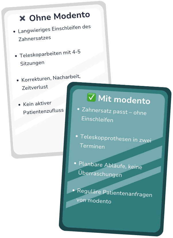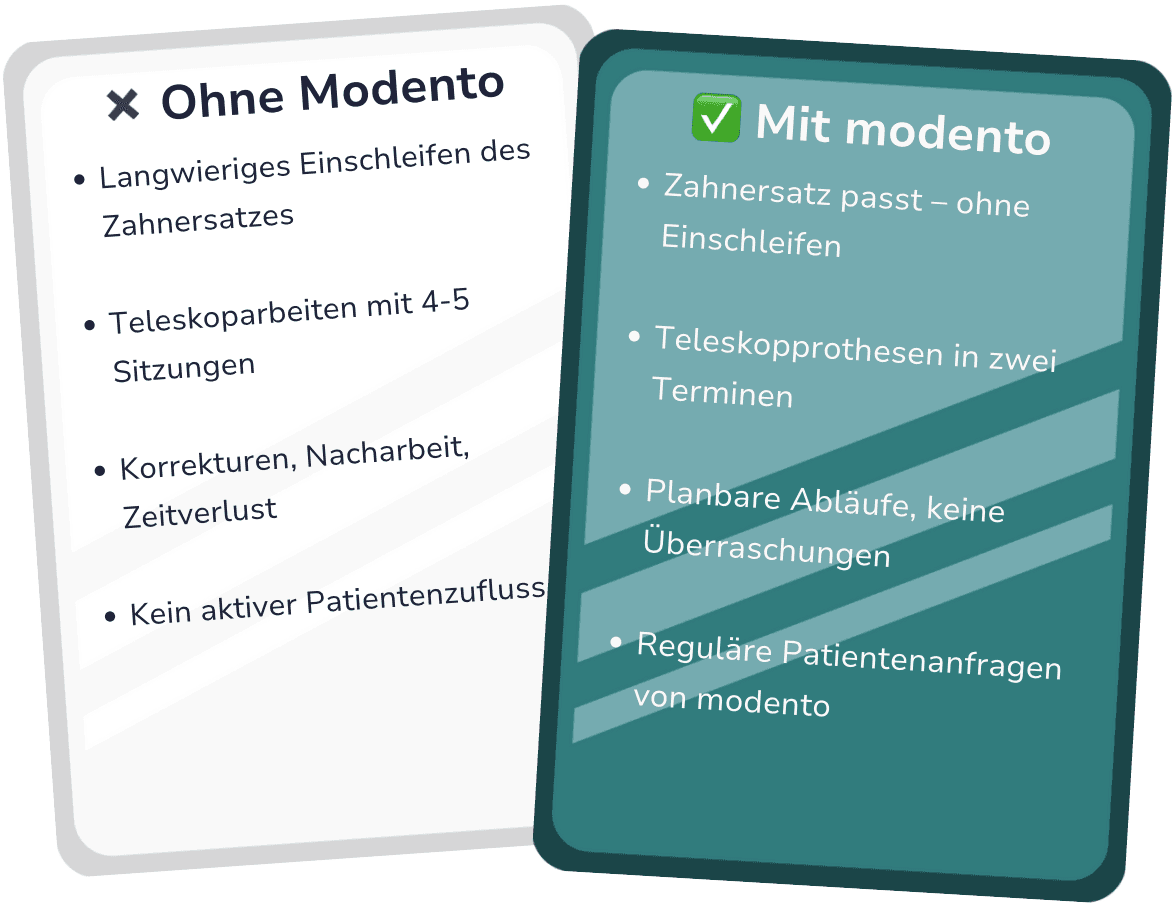 Ihr digitales Partnerlabor für moderne Zahnmedizin – mit Teleskoparbeiten in zwei Terminen, Zahnersatz ohne Einschleifen und 49 € Testkrone zum risikofreien Kennenlernen.
